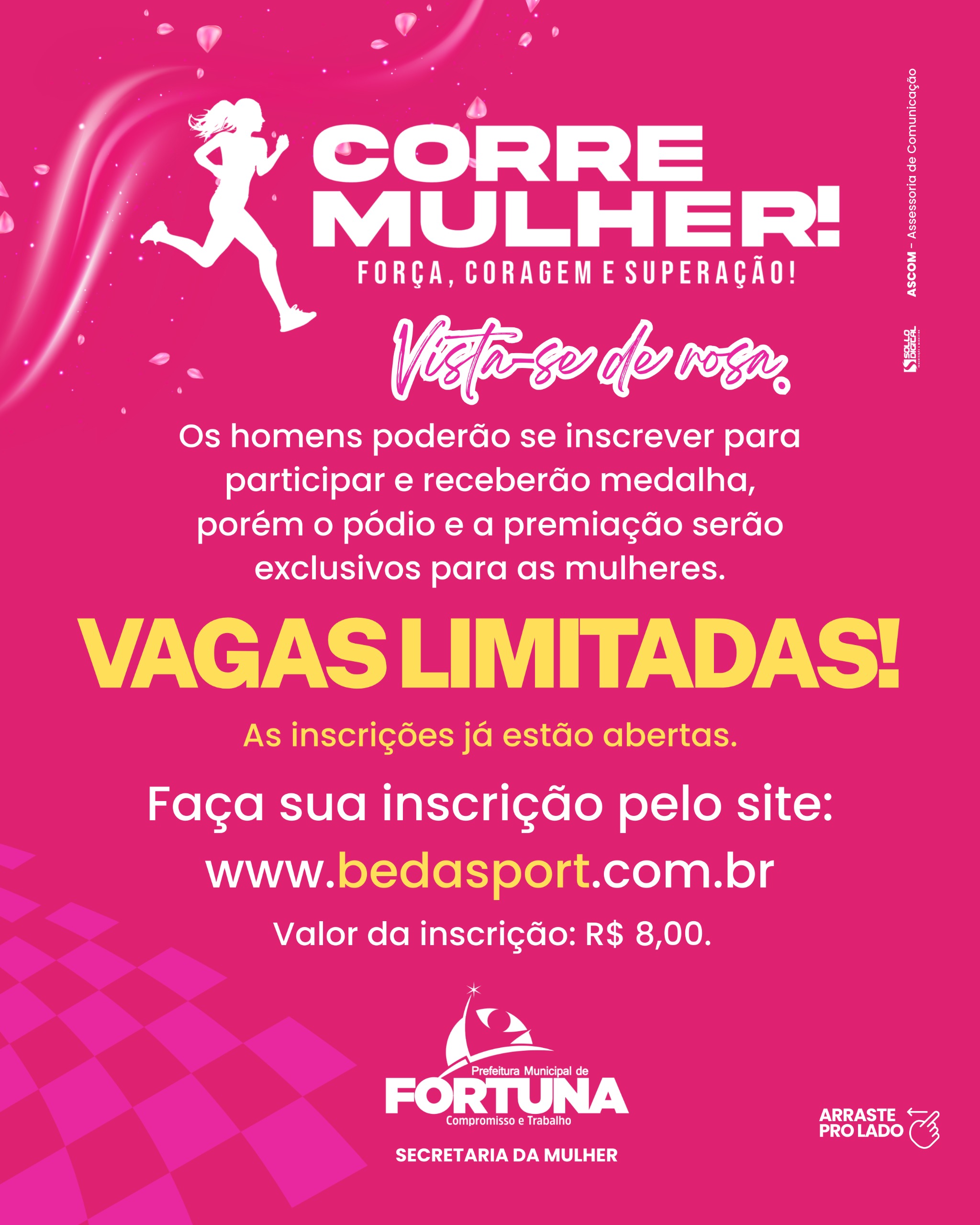 Mais do que uma corrida, o Corre, Mulher é um movimento de valorização, incentivo à saúde, ao bem-estar e ao protagonismo feminino. O evento contará com inscrição gratuita, cronometragem oficial e premiação em dinheiro, promovendo inclusão, competitividade saudável e ampla participação da comunidade.